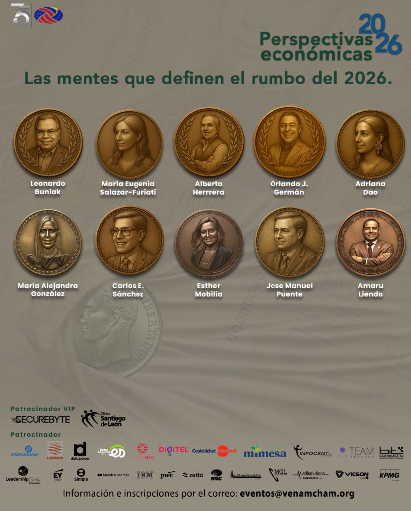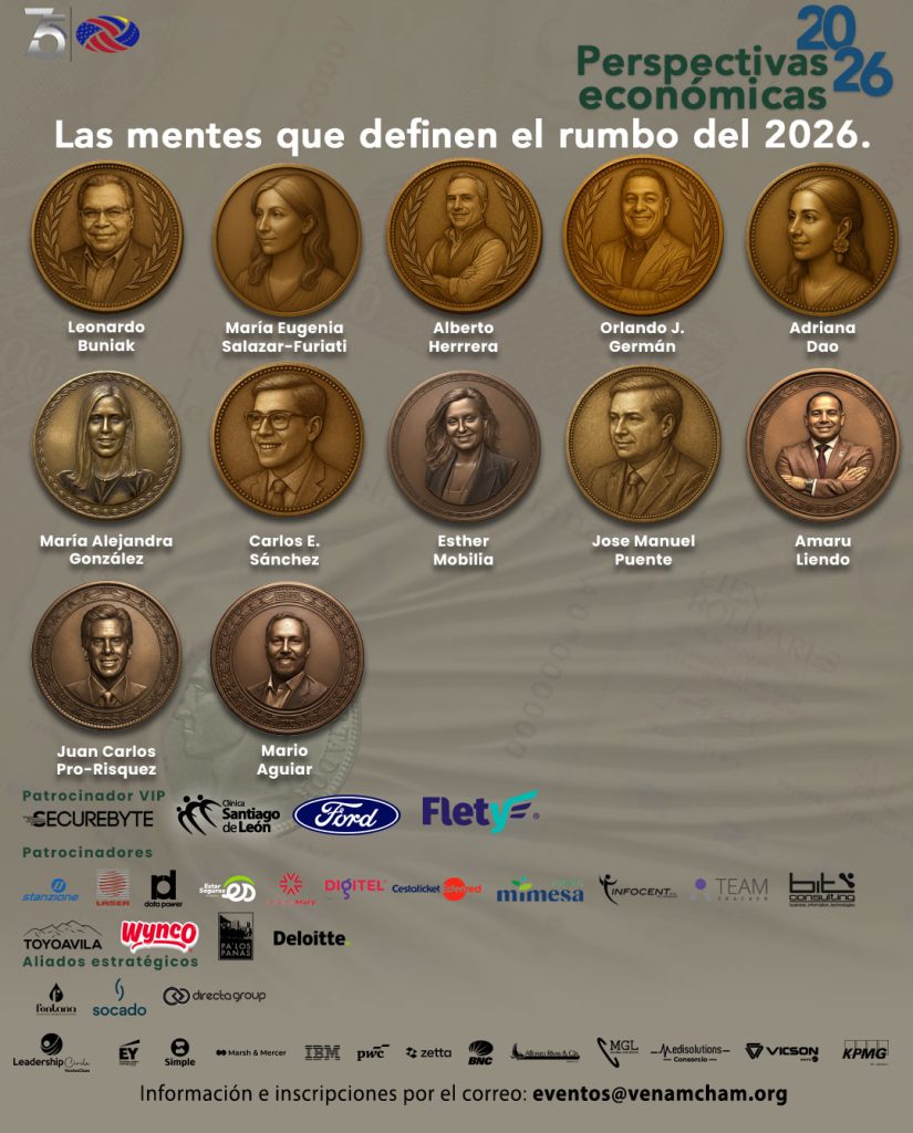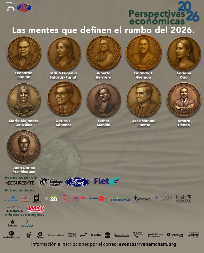 VenAmCham con el claro objetivo de ofrecerle a su comunidad empresarial y a la sociedad en general la información más actual sobre el acontecer nacional e internacional, presenta Perspectivas Económicas 2026, evento que se estará realizando el próximo 26 de febrero desde las 8:00 a.m. hasta 12:00 p.m. en las instalaciones de la Quinta Esmeralda.
