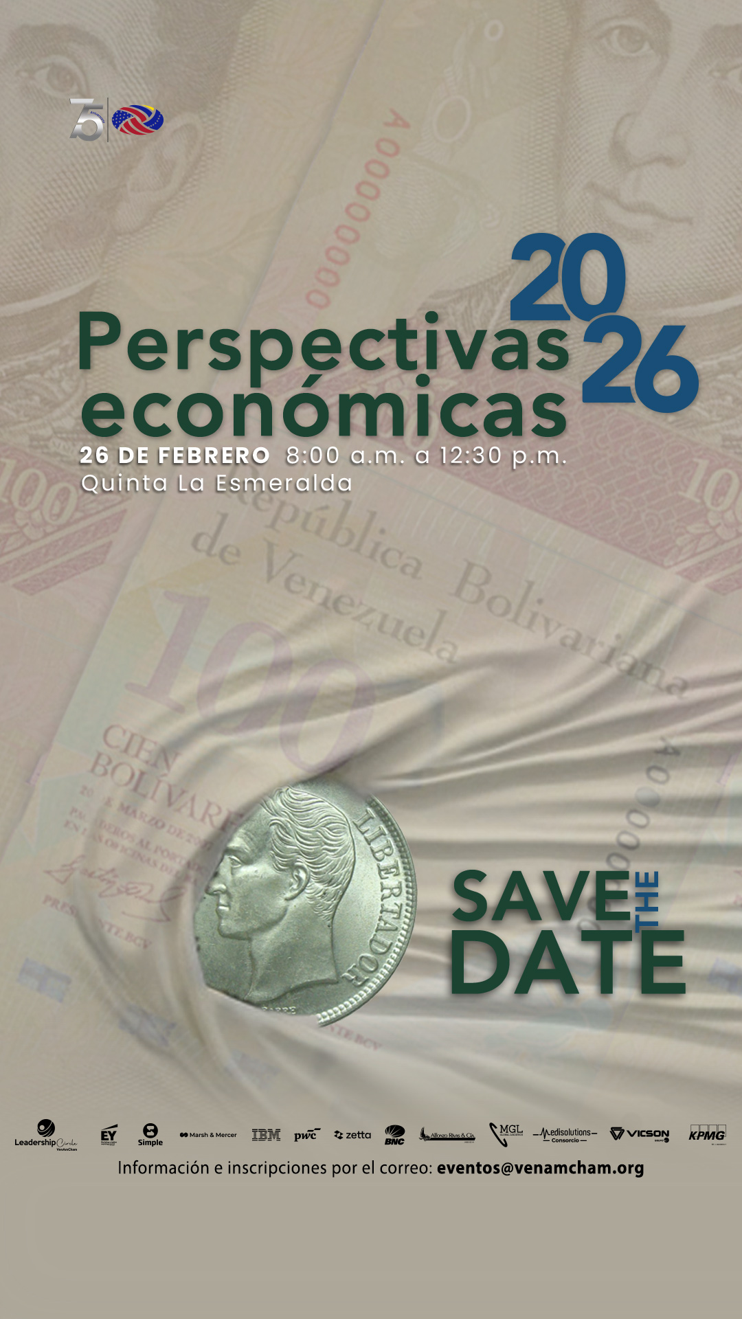 La Cámara Venezolano-Americana de Comercio e Industria (VenAmCham) con el claro objetivo de ofrecerle a su comunidad empresarial y a la sociedad en general la información más actual sobre el acontecer nacional e internacional, presenta Perspectivas Económicas 2026, evento que se estará realizando el próximo 26 de febrero desde las 8:00 a.m. hasta 12:00 p.m. en las instalaciones de la Quinta Esmeralda.