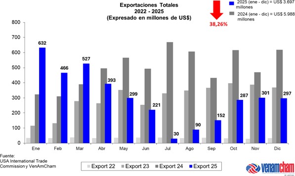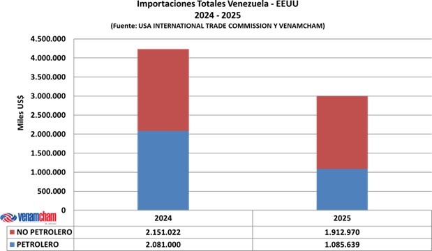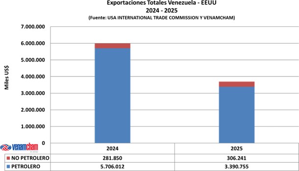 De acuerdo con las cifras publicadas por el USA International Trade Commission, el total de las exportaciones venezolanas durante el año 2025 hacia los Estados Unidos alcanzaron $ 3.697 millones, representando unadisminución de 38,26% ($ 2.291 millones), en comparación con el cierre del año 2024, cuando las exportaciones totales alcanzaron $ 5.988 millones.