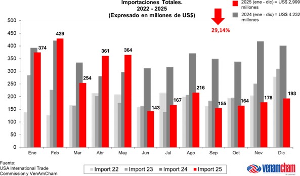 En lo referente al total de las importaciones provenientes de los Estados Unidos de América y de acuerdo con el USA International Trade Commission, estas alcanzaron los $ 2.999 millones para el cierre del año 2025 disminuyendo un 29,14% ($ 1.233 millones) en comparación con el total de importaciones para el cierre del año 2024 cuando fueron de $ 4.232 millones.